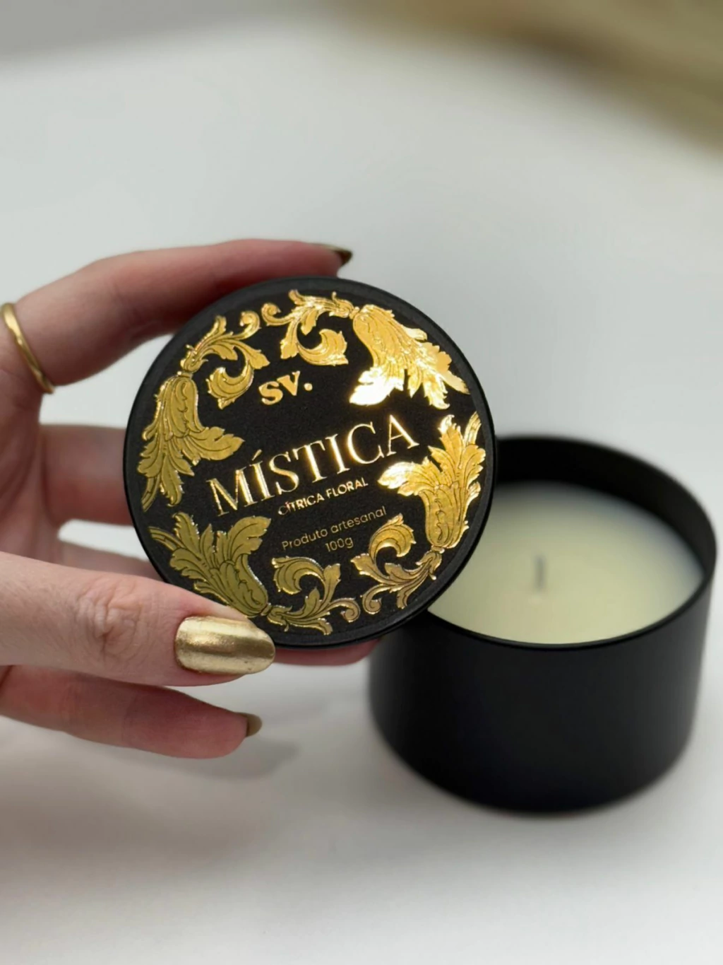 Produzida com cera vegetal e acabamento luxuoso, sua embalagem preta fosca com detalhes dourados faz dela também um item decorativo de presença. Ideal para ambientes que pedem equilíbrio, introspecção ou um toque de poder feminino.